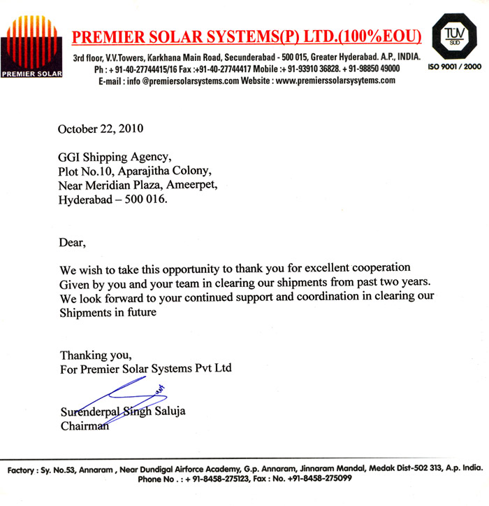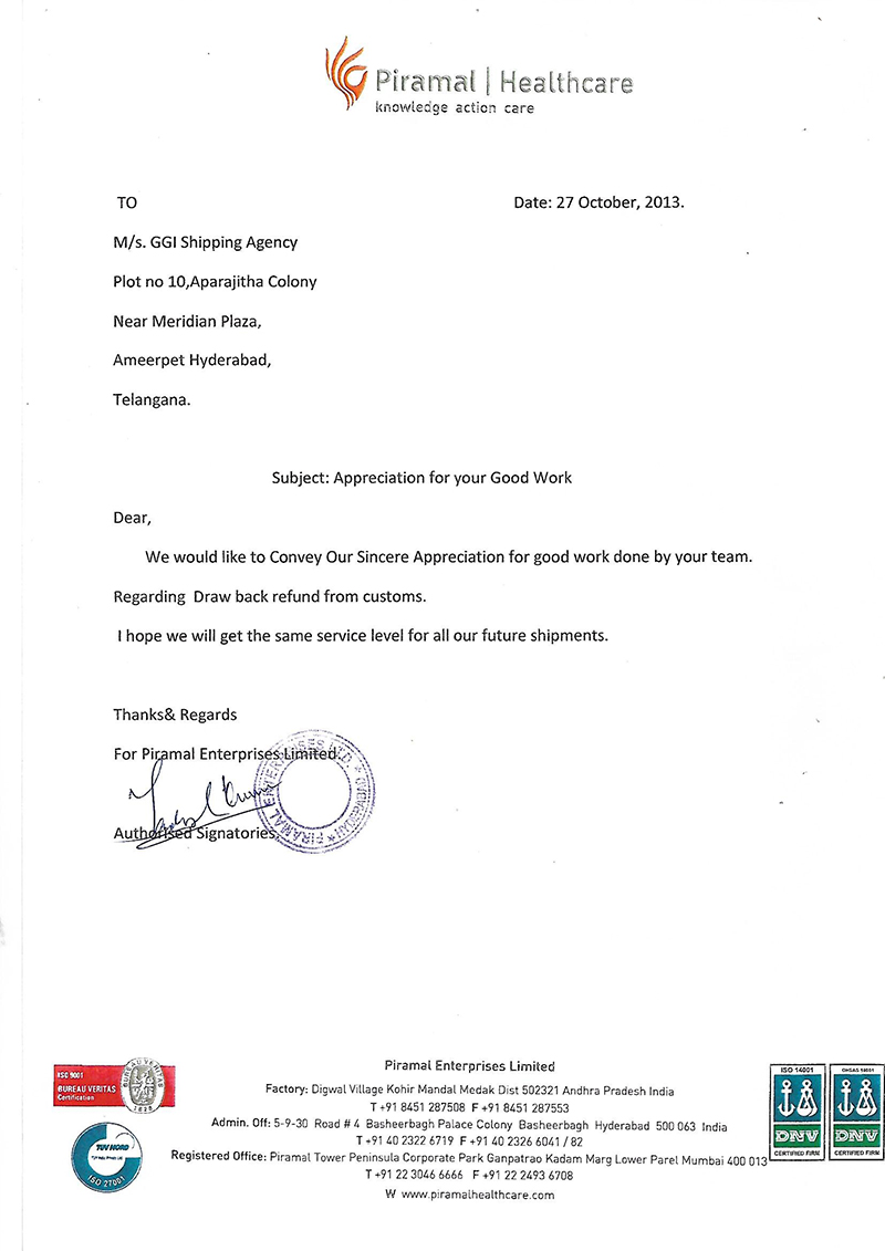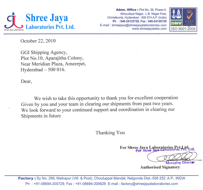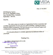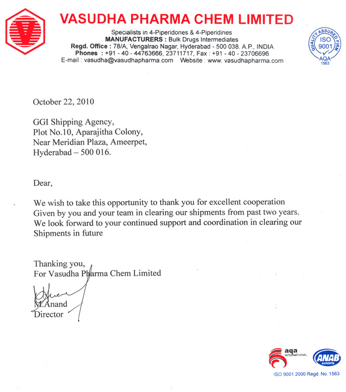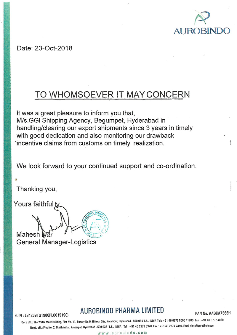 M/s.GGl Shipping Agency, Begumpet, Hyderabad in handling/clearing our export shipments since 3 years in timely with good dedication and also monitoring our drawback incentive claims from customs on timely realization.