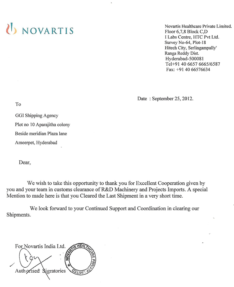 We wish to take this opportunity to thank you for Excellent Cooperation given by you and your team in customs clearance of R&D Machinery and Projects Imports. A special Mention to made here is that you Cleared the Last Shipment in a very short time.